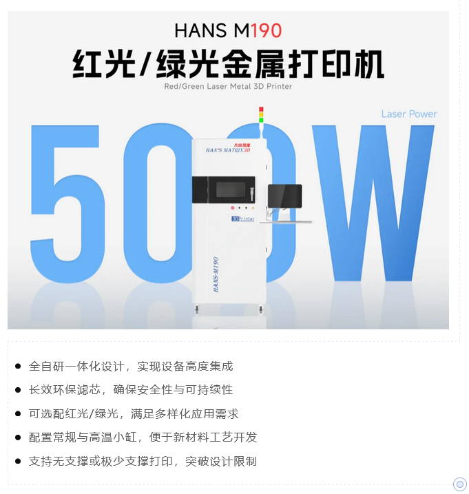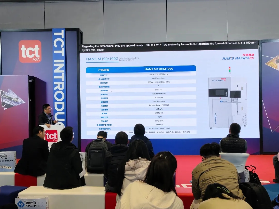 17日下午,大族聚维为现场观众带来了一场精彩的演讲,推出最新款红光/绿光金属3D打印设备HANS-M190/190G。HANS-M190/190G采用全自主研发的一体化架构,高度集成。光源可选红光或绿光,可稳定打印纯铜、铜合金等高反材料,满足3C电子、航空航天、医疗齿科等领域复杂部件需求。